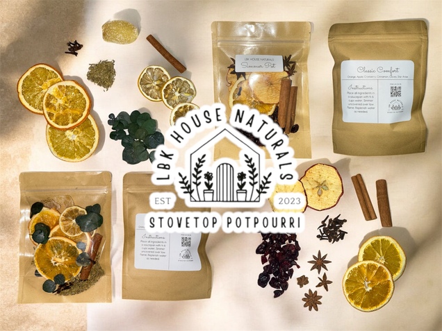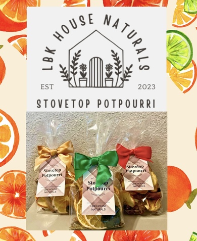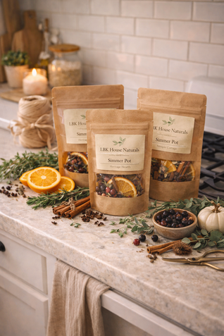 At LBK House Naturals, I handcraft small-batch simmer blends using real, recognizable ingredients — dried citrus, florals, herbs, and whole spices. No mystery fragrances. No artificial fillers. Just thoughtfully paired elements that fill your home with warmth, comfort, and a little everyday magic.